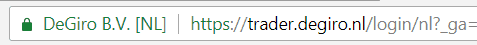 Oke, simpel. Zonder in te loggen op je eigen account wordt het namelijk lastig om iets te aan- of verkopen. Oke. je gaat naar de site van DeGiro. In de rechter bovenhoek zie je de optie: Inloggen. Klik hierop en check eerst of je de juiste site te pakken hebt en je een groen slotje ziet (afhankelijk van je internet browser) zoals hieronder. Ja? dan kunnen we verder! Vul vervolgens je gebruikersnaam en wachtwoord in en log in.