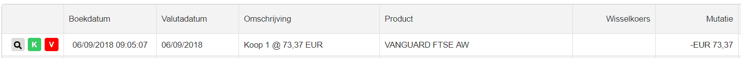 Om te komen bij je rekeningoverzicht ga je links bovenaan de pagina in de zwarte balk naar Overzichten en kies je Rekening. Je ziet nu een overzicht van alle transacties die in je account hebben plaatsgevonden voor de geselecteerde periode. Zoek hierin de datum van aankoop en het product (in dit geval Vanguard FTSE All-World UCITS ETF) van aankoop op. In de kolom “Mutatie” zie je de prijs waarvoor de stukken in totaal zijn aangekocht. Mocht je de prijs per stuk willen weten dan is dit terug te vinden in de kolom “Omschrijving”. Mochten er nog kosten zijn gemaakt bij de aankoop van de stukken, dan zullen deze in de kolom “Boekdatum” op dezelfde datum en tijd genoteerd staan als de aankoop van de stukken.